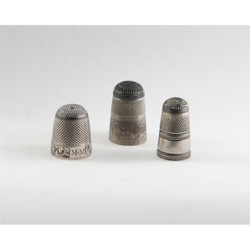 Three George III thimbles with steel domes: one with vermicelli engraving initialled "MN", c.1800, another smaller with a plain band around the lower body, (perforated) c.1800, another with a chased lower band and the initials "MM", maker's mark of Samuel Meriton, c.1780. (3)