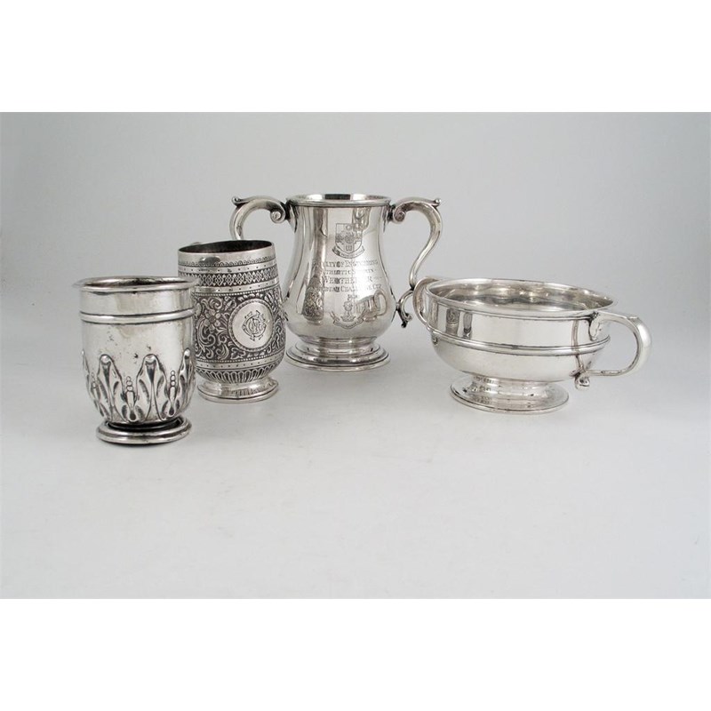A mixed lot: a late Victorian two handles baluster trophy cup, inscribed, by R Martin & E Hall London 1893, a Victorian embossed mug by Aldwinkle & Slater London 1883, a modern mug with a leaf calyx and a shallow two handled cup. (4) 36oz.