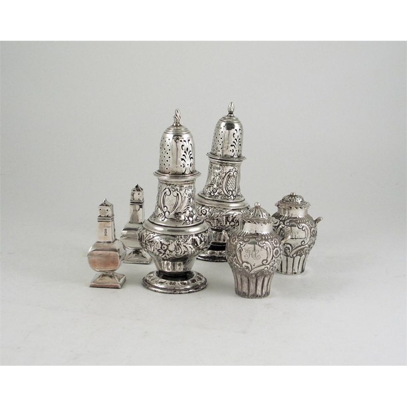 Peppers: A pair of embossed examples by G Nathan & R Hayes, Chester 1904, a smaller pair of embossed urn peppers by GM Jackson London 1895, and a pair of miniature pepperettes with loaded bases Birmingham 1906, the latter, 2.9 in (7.2 cm) 9oz weighable silver (6).