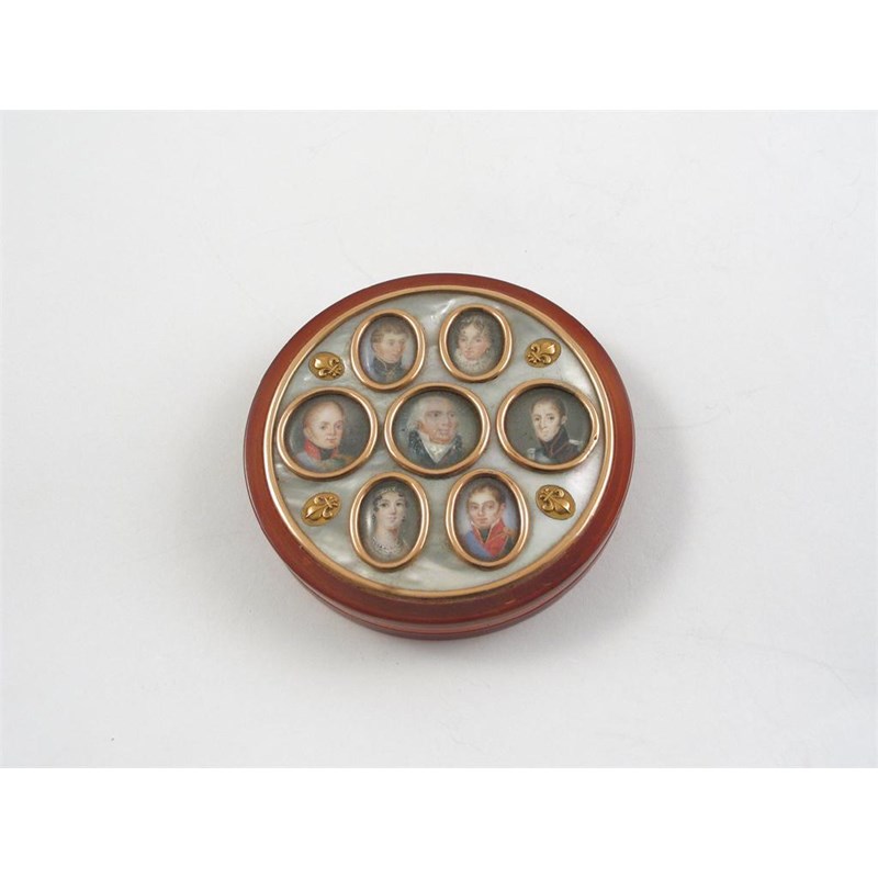 A late 18th century French circular blond tortoiseshell Boite a miniature, with a gold mounted mother of pearl cover set with seven miniature portraits (behind glass) and inset with four fleur de lys motifs, the central portrait probably despicting King Louis XVI, unmarked, 2.9in (7.4cm).