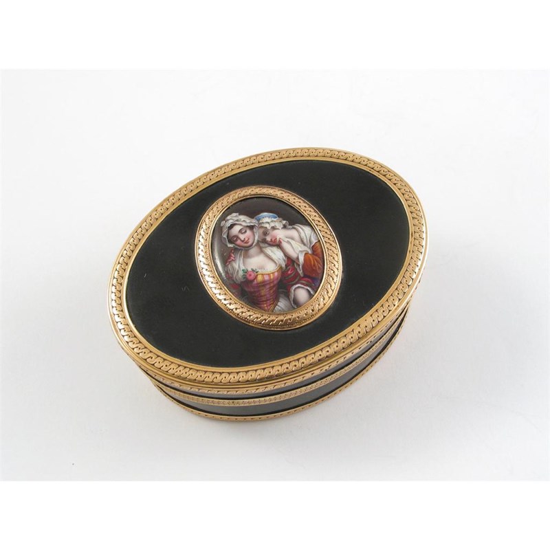 A late 18th century French gold mounted tortoiseshell Boite a miniature, oval outline with borders of chased ribbon-like decoration, the cover inset with a framed oval enamel placque painted with a young girl weeping on the shoulder of her more attractive companion, maker's mark 'PGS' for Pierre-Guillaume Sallot, Paris 1781, 3.4in (8.7cm)