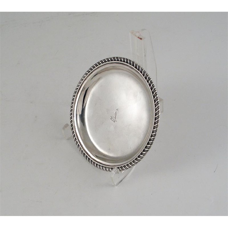 A George III Irish, circular wine funnel stand, with a central crest and gadrooned border, by William Nowlan, Dublin 1830, 4.25in (10.8cm) diameter, 2.25oz.