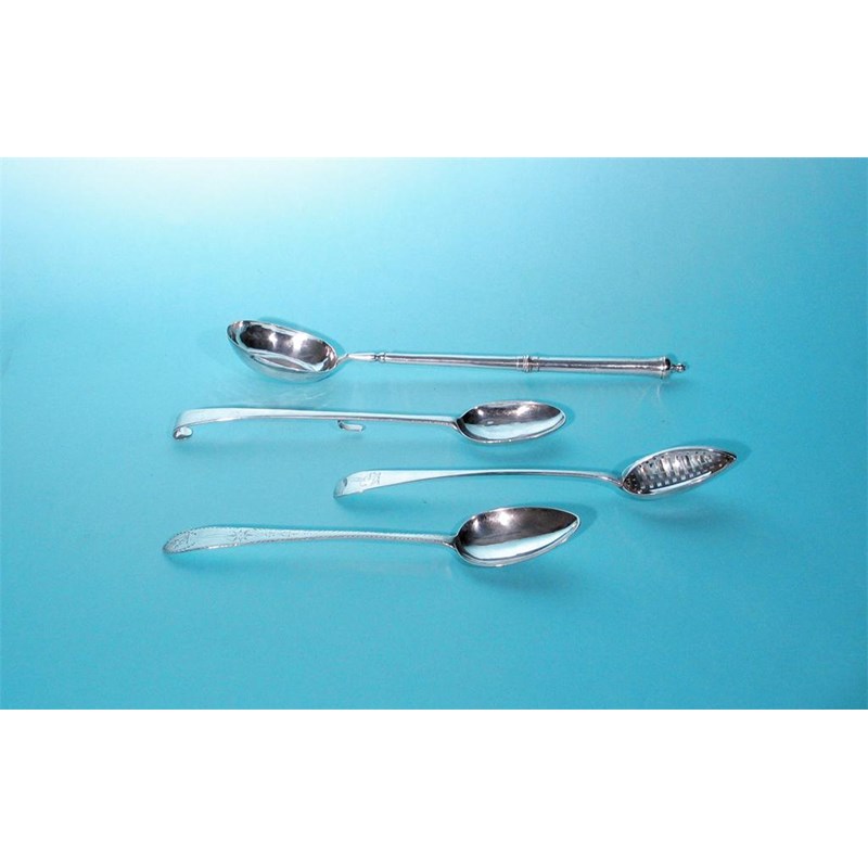 Cork: a George III Irish provincial strainer spoon, of basting size with a slot-pierced divider, crested, by Carden Terry (CT, Sterling), Cork 1780-1790, 12.25" (31cm) long, 3.6oz.