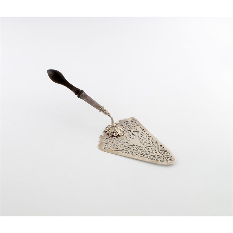triangular form, pierced foliate scroll decoration, wooden baluster handle, length 30.5cm, approx. weight 4oz.