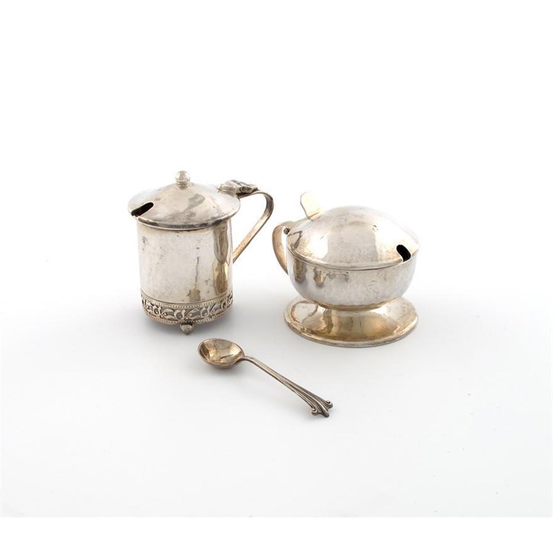 circular form, spot-hammered decoration, scroll handle, blue glass liner, plus an Arts and Crafts silver mustard pot by A.E. Jones, clear glass liner, approx. weight 3.7oz. (2)