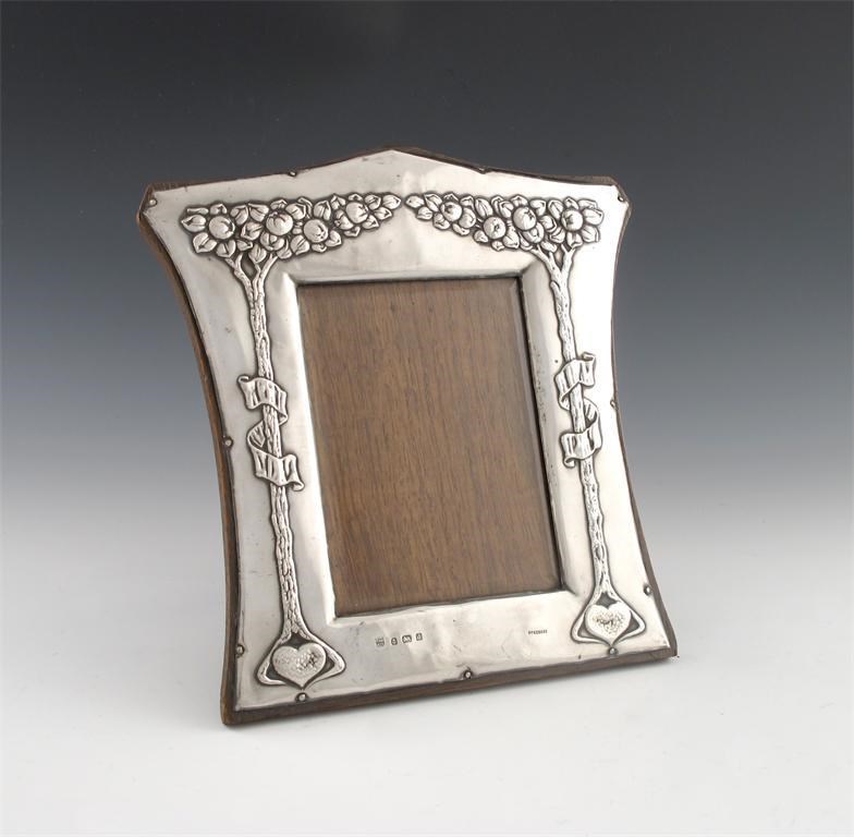 shaped rectangular form, embossed with fruit trees, banners and heart motifs, wooden easel back, height 21.5cm.