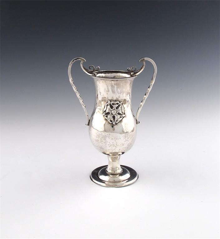 baluster form, spot-hammered decoration, twisted scroll handles, applied with an embossed Tudor rose and a monogram, on a raised circular foot, height 15.7cm, approx. weight 6oz.