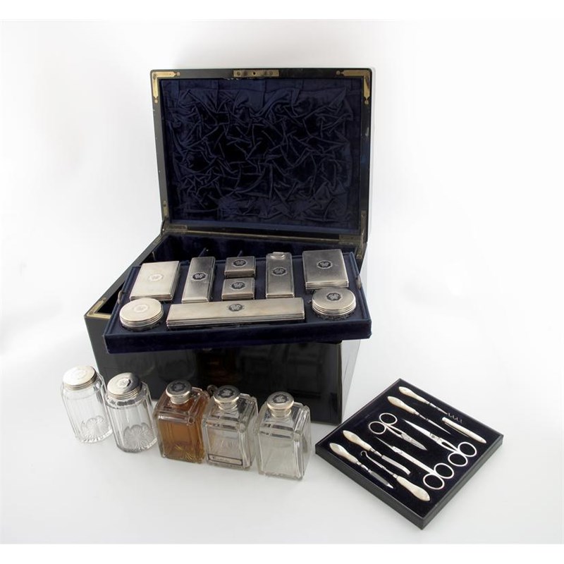 comprising an inkwell, a vesta box, three scent bottle, four toilet jars, four dressing-table boxes, the covers with engine-turned decoration and engraved with a monogram, plus a manicure set, the hinged cover with a mirror, and with a jewellery drawer, in a fitted brass bound box, approx. weighable 9oz.
