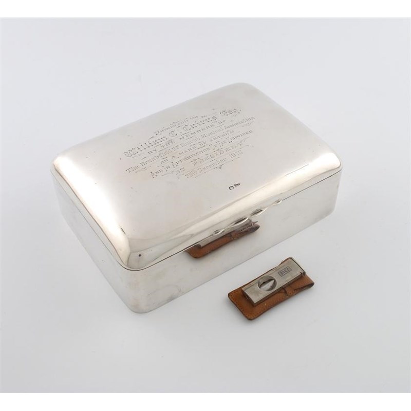 rectangular form, the hinged cover with a presentation inscription, plus an electroplated cigar cutter, length 21.3cm. (2)
