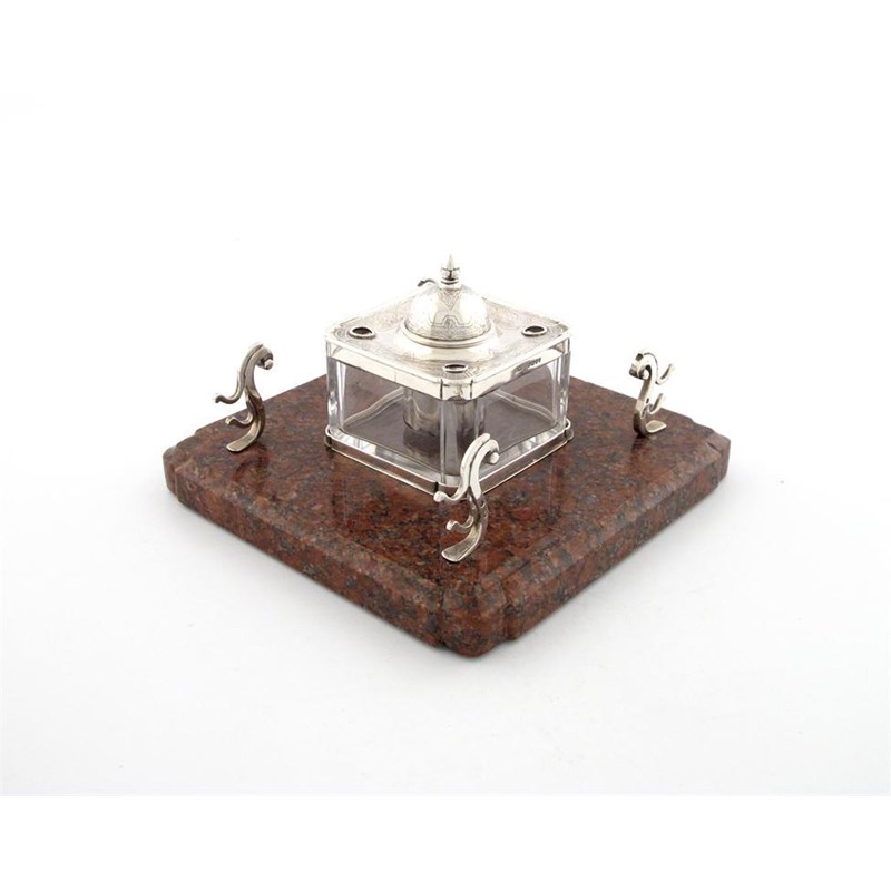 square form, the central silver mounted glass inkwell with four pen holes and a domed hinged cover, engraved decoration, the hard stone stand of square form and mounted with four scroll pen rests, width of base 18.5cm.