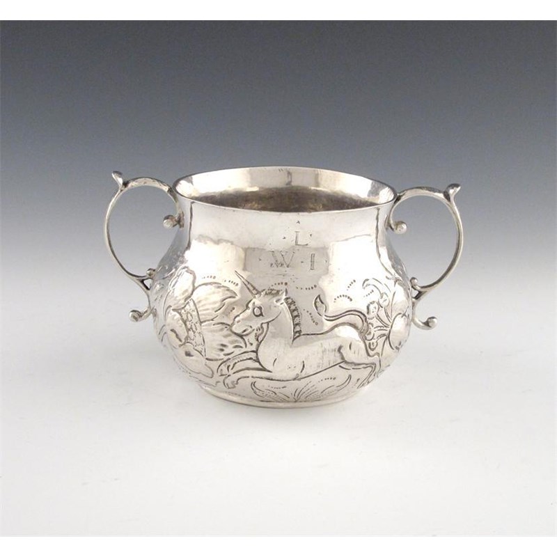 circular bellied form, embossed with a running unicorn and lion within foliate scroll decoration, scroll handles, the base scratch initialled 'L' over 'WI', width handle to handle 17cm, approx. weight 8.5oz.