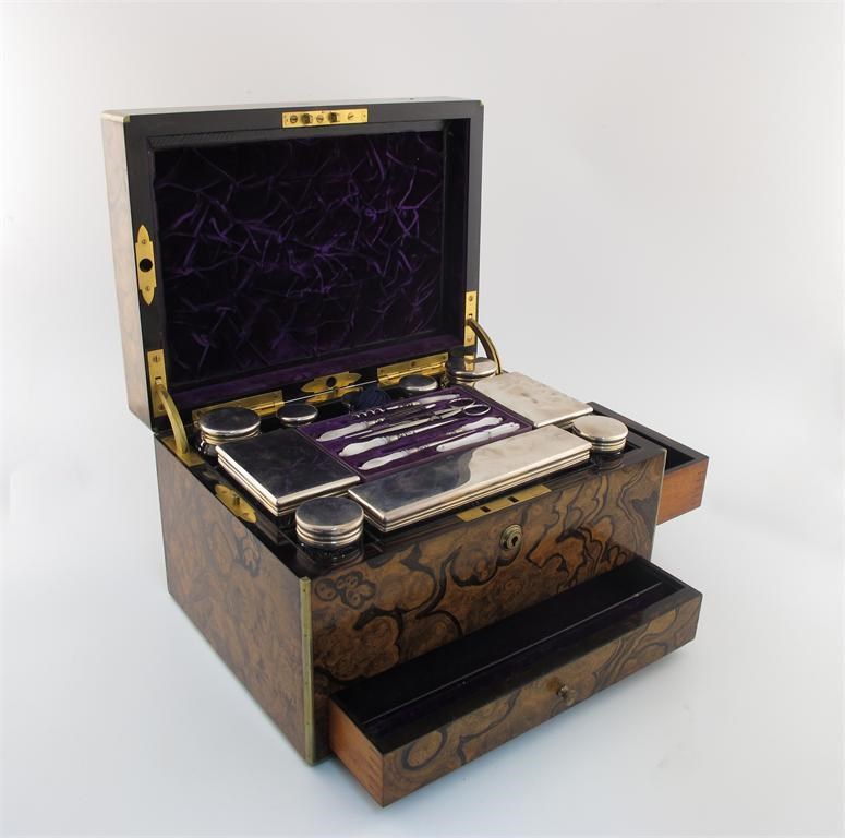 plain covers, comprising: three scent bottles, seven toilet jars / boxes, plus a seven piece manicure set with mother-of-pearl handles, in a fitted brass bound walnut travelling case with two secret drawers, the hinged cover fitted with a mirror, length 30.8cm, approx. weighable 7oz.