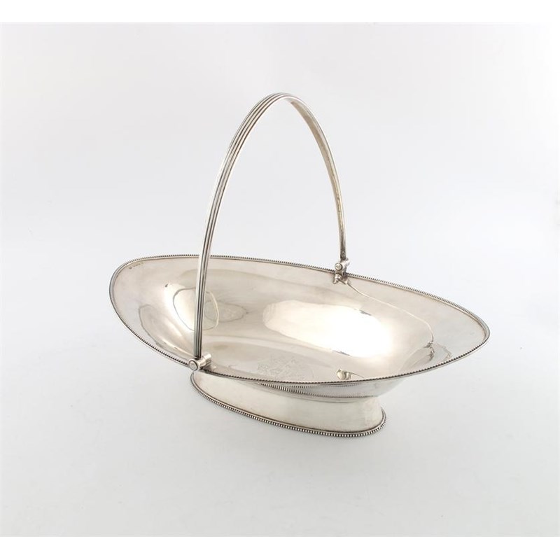 oval form, beaded borders, reeded swing-handle, on a raised oval foot, the centre engraved with an armorial, length 37.7cm, approx. weight 30oz.