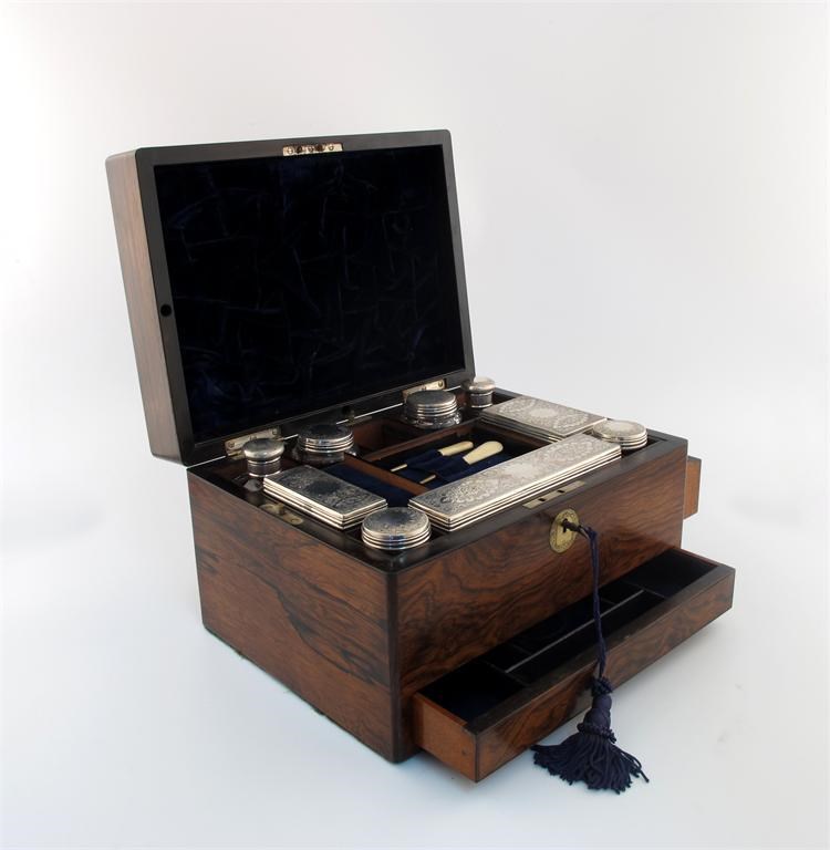 the covers with engraved foliate decoration, comprising: two scent bottles, six toilet jars / boxes, plus a three-piece manicure, in a fitted brass bound travelling case with two secret drawers, the hinged cover fitted with a mirror, length 30.2cm, approx. weighable 4.6oz.