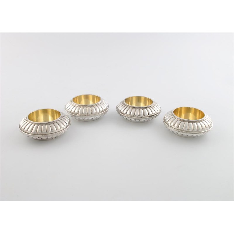 circular fluted cushion form, central reeded girdle, gilded bowls, on circular bases, diameter 8.8cm, approx. weight 14oz. (4)