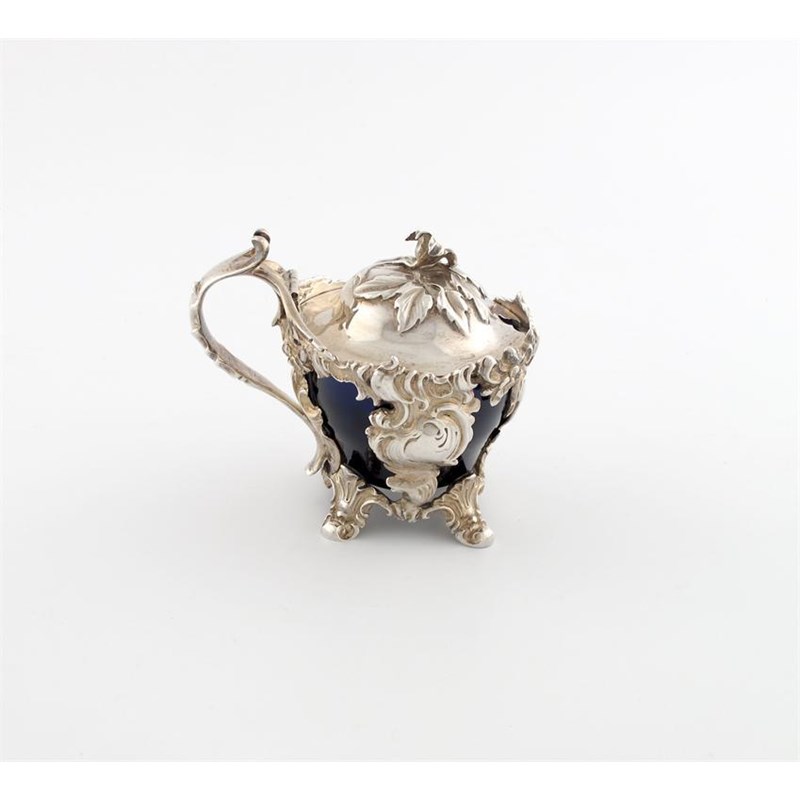 tapering circular form, pierced and embossed foliate scroll decoration, domed cover with a flower finial, scroll handle, on four shell bracket feet, with a blue glass liner, height 9.8cm, approx. weight 8.4oz.