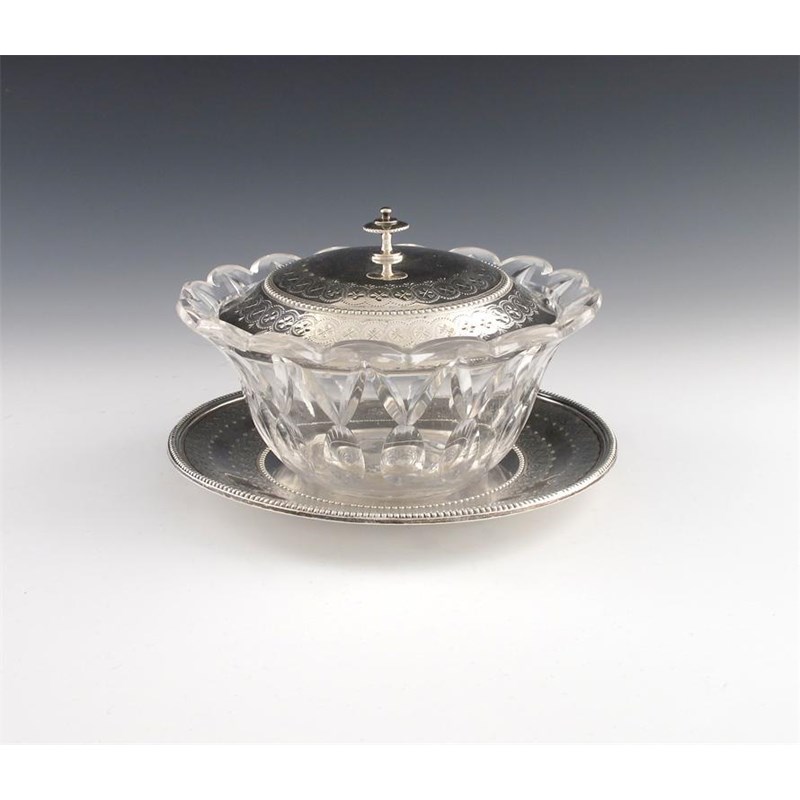 circular form, engraved decoration, beaded borders, cut glass bowl, the pull-off cover with a knop finial, diameter of base 17.8cm, approx. weight 9oz.