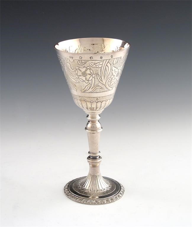 modelled as a James I wine cup, chased decoration on a matted background, tapering stem, on a raised fluted foot, height 16.5cm, approx. weight 8oz.