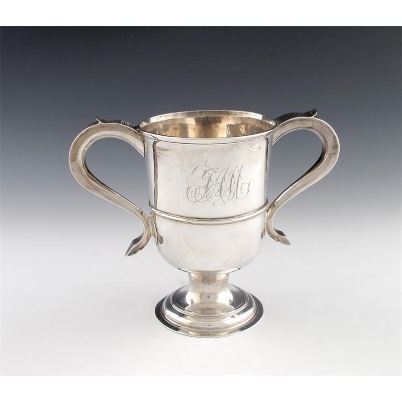 circular form, central girdle, scroll handles, on a raised circular foot, engraved with a monogram, height 16cm, approx. weight 17oz.