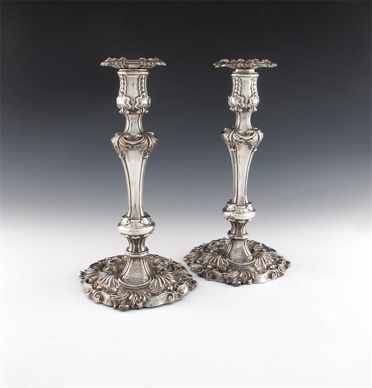 baluster form, scroll shoulders, on raised circular bases with foliate scroll decoration, detachable drip pans, engraved with an armorial, height 28cm. (2)