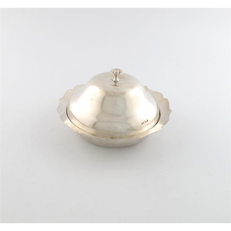 circular form, wavy edge border, domed hinged cover with a flower finial, diameter 20cm, approx. weight 17oz.