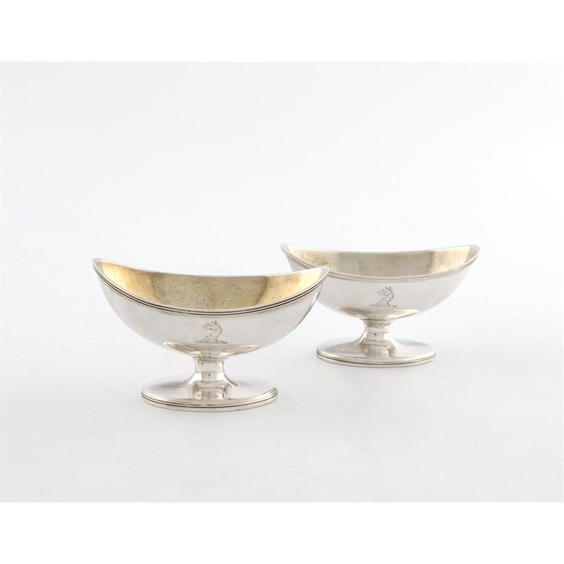 oval form, gilded bowls, on raised oval bases, reeded borders, length 10.2cm, approx. weight 5oz. (2)