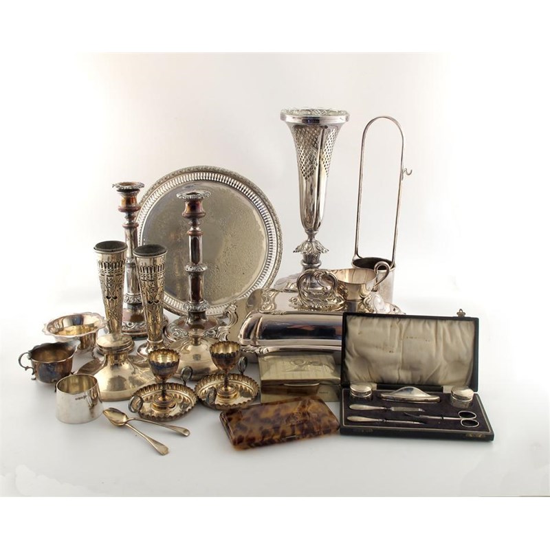 comprising: silver items, a silver powder jar and cover, London 1931, plus a pair of silver trumpet vases, with pierced decoration, Chester 1902, a capstan inkwell, cover a.f, a cased six piece manicure set, plus electroplated items, an epergne, a pair of candlesticks, a salver, an entree dish and cover, two egg cups and stands with spoons, a cream and sugar bowl, a small bowl, a cigarette box, and a simulated tortoiseshell cigarette case, approx. weighable 4.6oz. (qty)