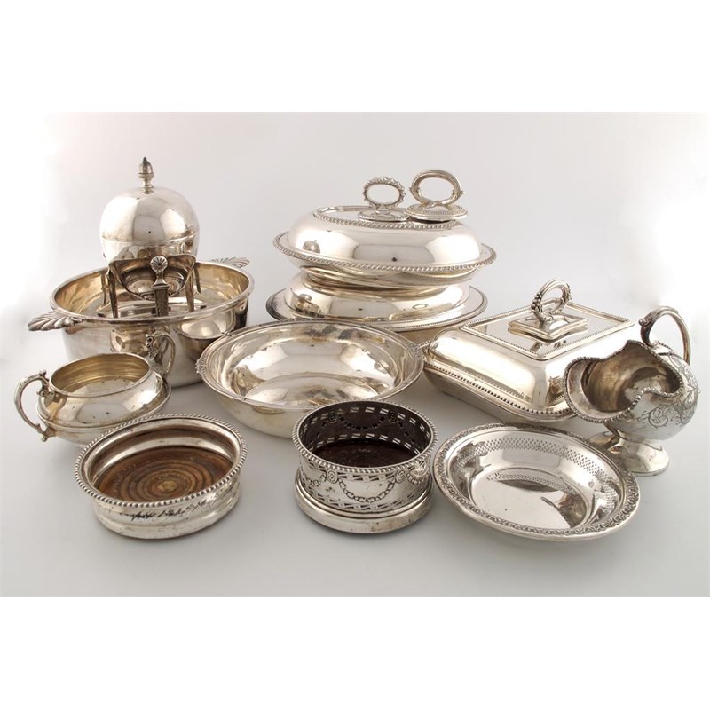 comprising silver items: a single wine coaster of circular form, pierced, engraved and embossed decoration, Chester 1908, plus a two-handled sugar bowl, London 1934, and a French silver bowl, circular form, foliate border, plus electroplated items: three entree dishes and covers, a French bowl, an egg coddler and burner, a sugar scuttle, a coaster and a dish, approx. weighable 21oz. (qty)