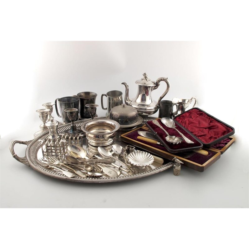 comprising: a large Victorian oval tray, part fluted decoration, the centre with an armorial, plus a coffee pot, two pairs of candlesticks, a cased pair of fish and salad servers, a wine coaster, a jug, various mugs and other items including a quantity of flatware. (qty)