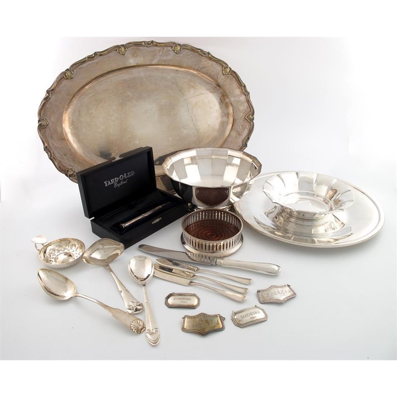 comprising silver items: a Yard-o-led pencil, two wine labels, two Danish spoons, a sauce ladle, plus electroplated items: two bowls, a coaster, a meat platter and a plate. (qty)