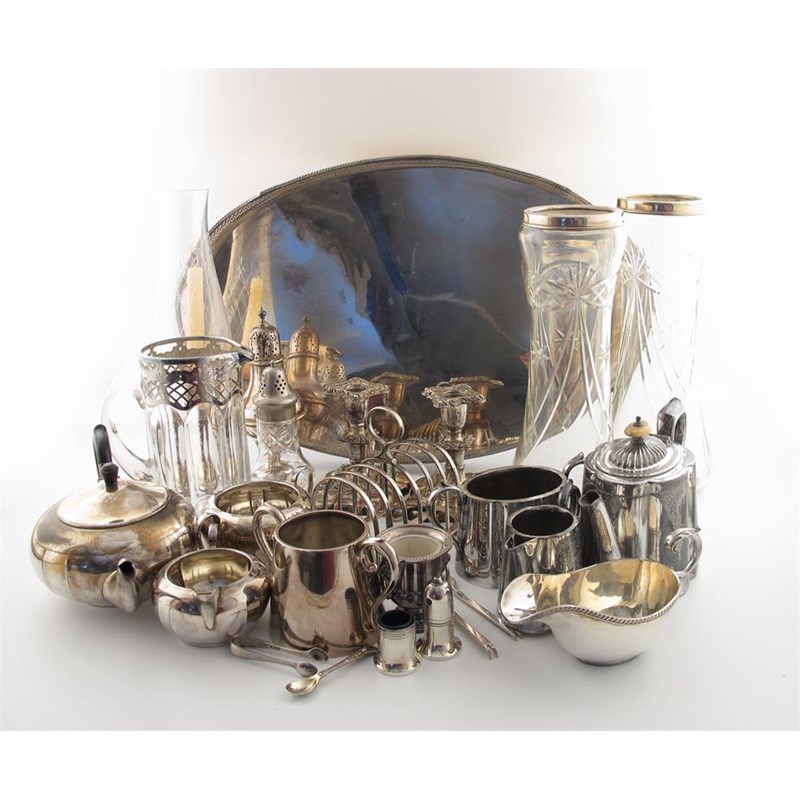 comprising: silver items, an American silver overlay lemonade jug, the mounts with foliate decoration, plus a pair of silver mounted vases, London 1927, plus electroplated items, a gallery tray, a toast rack, a pair of candlesticks and other items. (qty)