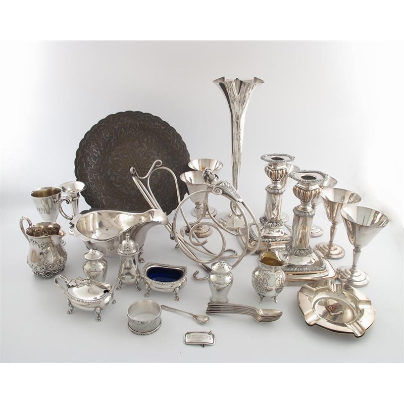 comprising silver items: a trumpet vase, of tapering circular form, Sheffield 1904, height 30cm, a jug, a double spirit measure, a vase, a pair of pepper pots, a set of six coffee spoons, a wine label, a napkin ring, and a continental jug, plus electroplated items: an Elkington wine cradle, scroll form, with a figural thumb-piece, a pair of old Sheffield plated candlesticks, a set of six goblets, two ashtrays, a sauce boat and an Islamic plate, approx. weighable 12oz. (qty)
