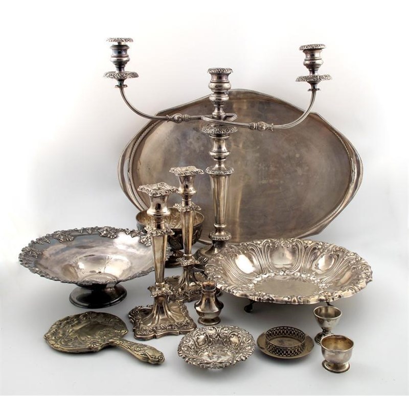 comprising: a three-light candelabrum, tapering circular form, reeded scroll branches, foliate borders, on raised circular bases, and an oval gallery tray, plus two dishes, a rose bowl, a bonbon dish, a pair of candlesticks, and five small items. (qty)