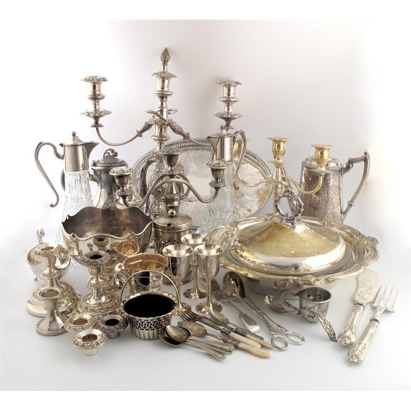 comprising tea sets, trays, candelabra, and other items, in two boxes. (qty)