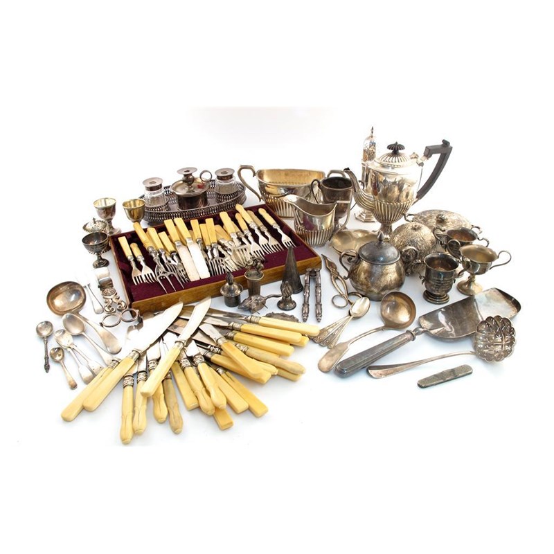 comprising: an oval inkstand, a small coffee pot, a cream jug, a sugar bowl, a string box, a sugar caster plus other items including a small quantity of flatware. (qty)