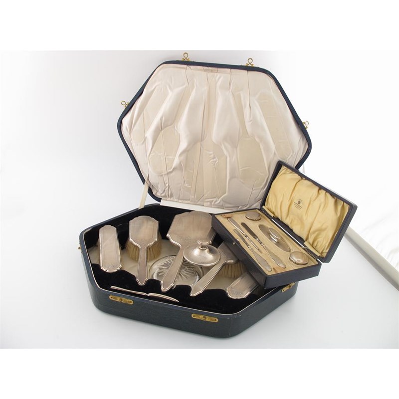 engine turned and foliate decoration, in a fitted case, plus a cased six piece manicure set and a silver mounted powder jar. (3)