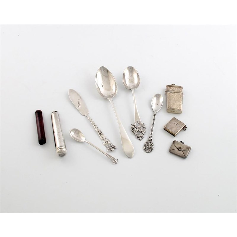 comprising: a stamp case of book form, a stamp case of letter form, a lancet case, a Scottish Celtic point dessert spoon, a Victorian Diamond Jubilee butter knife, a Regimental spoon, an amber cigarette holder in a silver case, a mustard spoon, and an electroplated spoon, approx. weighable 3.5oz. (9)