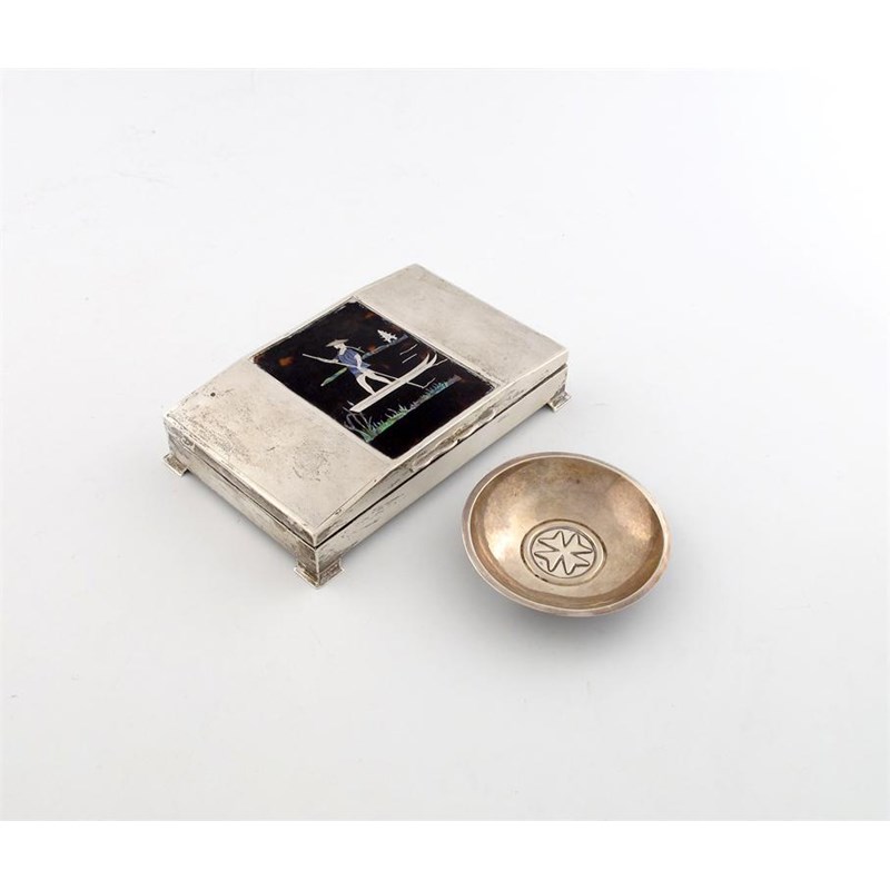 rectangular form, the hinged cover applied with an tortoiseshell plaque inlaid with a silver and abalone shell scene of an oriental man in a boat, plus a Maltese silver dish. (2)