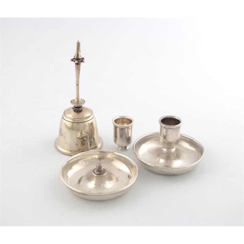 circular form, with two unmarked unassociated capitals, plus a continental silver table bell, with a beaded border and engraved with a crowned 'H', lacking clanger, approx. weight 3.8oz. (5)