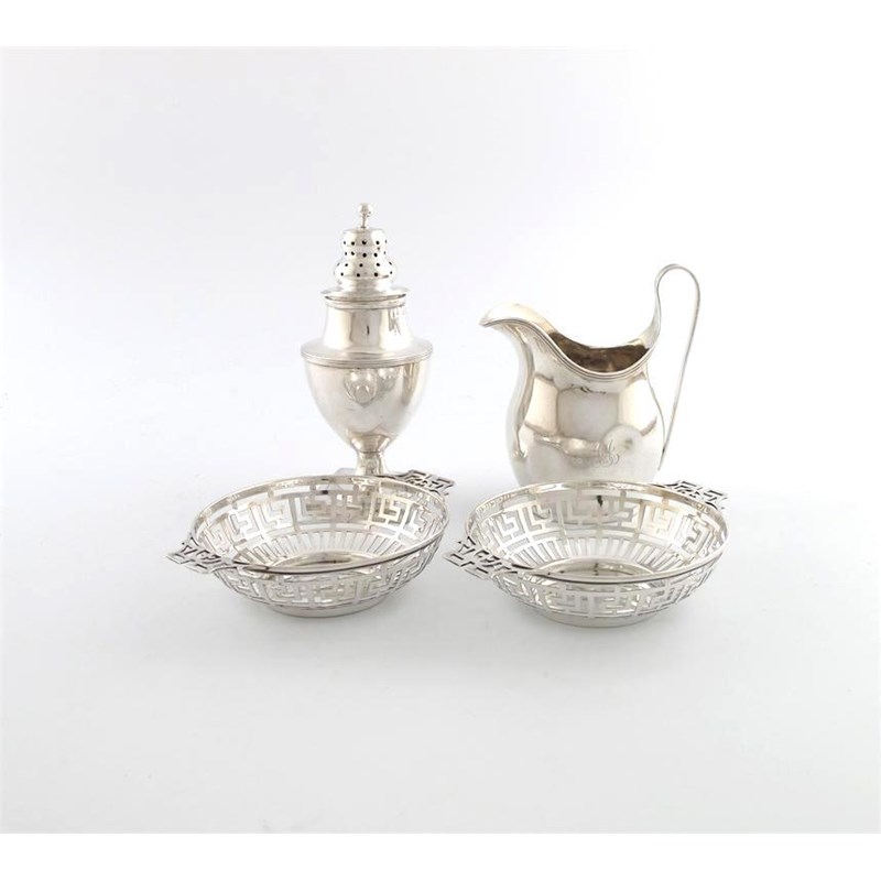 comprising: a George III caster, of vase form, on a raised square base, London 1805, a silver cream jug of oval form, Chester 1934, and a pair of pierced silver bonbon dishes, approx. weight 10oz. (4)