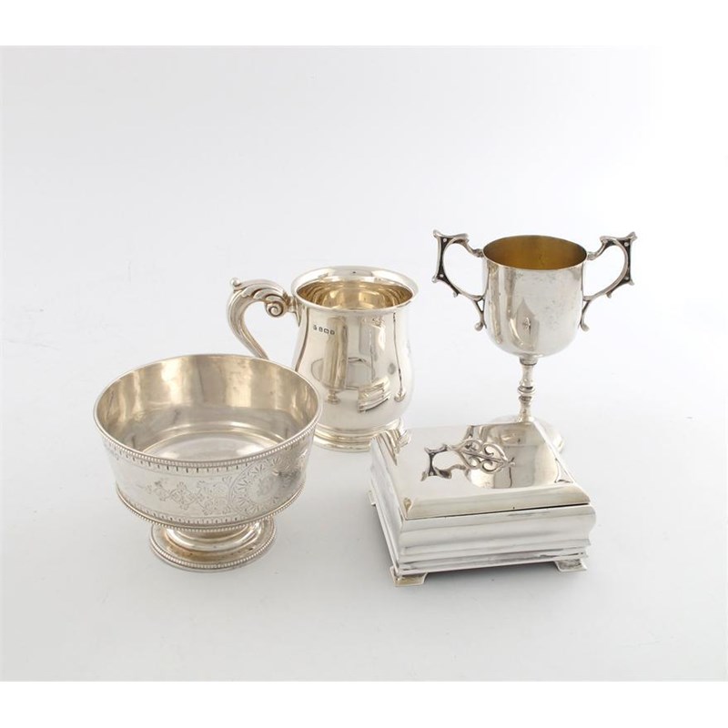 comprising: a Victorian sugar bowl, engraved decoration, beaded borders, by Martin, Hall and Company, London 1874, plus a mug of baluster form, plus an electroplated trophy cup and a Spanish box and cover, approx. weighable 10oz. (4)