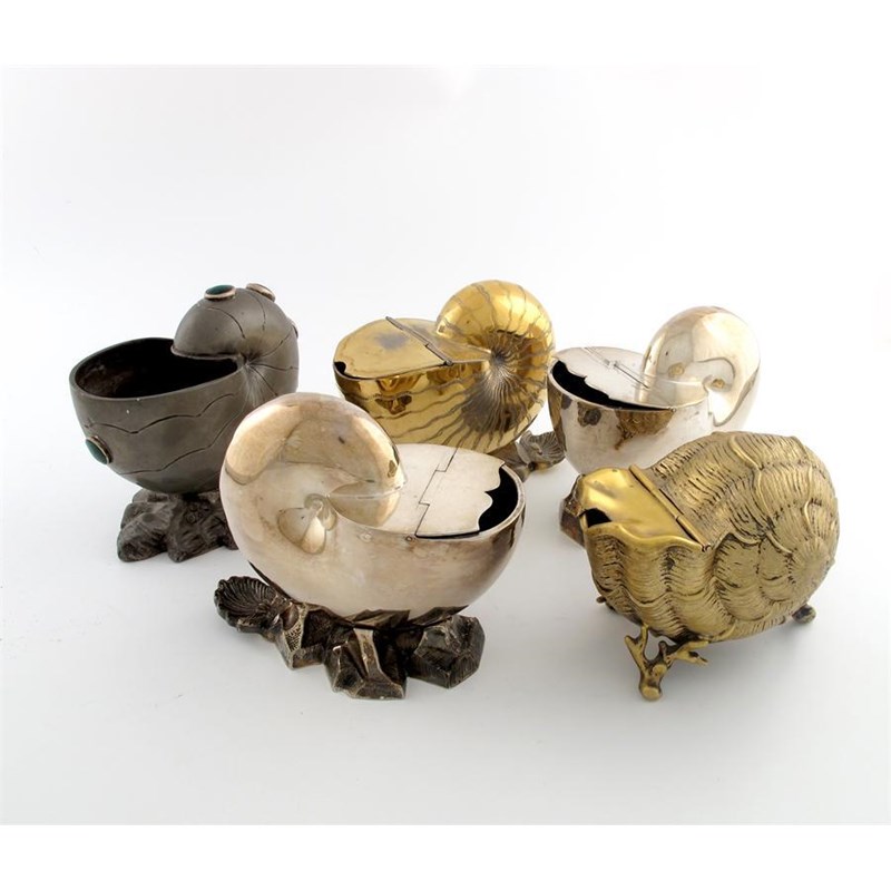 comprising: three of conventional nautilus form, on rocky bases, one gilded, plus one on Britannia metal and inlaid with green hard stones, and one gilded and of shell form, on three coral feet. (5)
