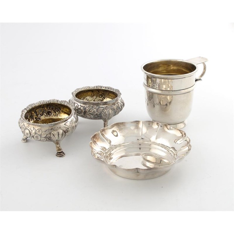 comprising: a pair of Victorian salt cellars, London 1839, circular form, embossed foliate decoration, gadroon borders, plus a mug of circular form, and a dish of lobed circular form, approx. weight 11oz. (4)