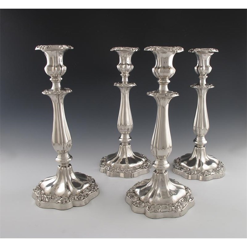 fluted baluster form, campana shaped capitals, foliate scroll bases, on raised shaped lobed circular bases with foliate scroll borders, height 31.5cm. (4)