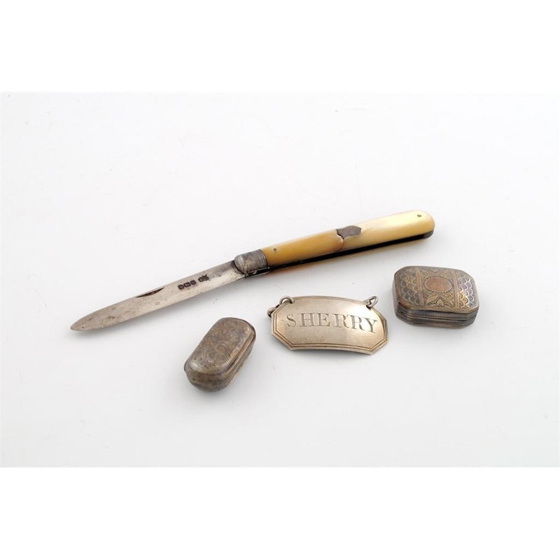 comprising: a George III vinaigrette, rectangular form, canted corners, by Cocks and Bettridge, Birmingham 1813, another vinaigrette of oblong form, a George III Scottish wine label incised 'SHERRY', and a silver and mother-of-pearl fruit knife. (4)