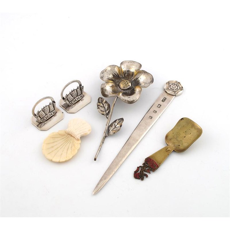 by J.W.B, Birmingham 1913, modelled as the naval crown, length 3.7cm, a modern silver letter knife, by J. J. F., London 1995, tapering form, the terminal embossed with a Tudor rose, length 19.4cm, an early 19th century bone caddy spoon, with a damaged finial and later loose shell replacement, plus a brass caddy spoon, and an electroplated sprinkler/shaker, unmarked, modelled as a flower, approx. weight 3.5oz. (6)