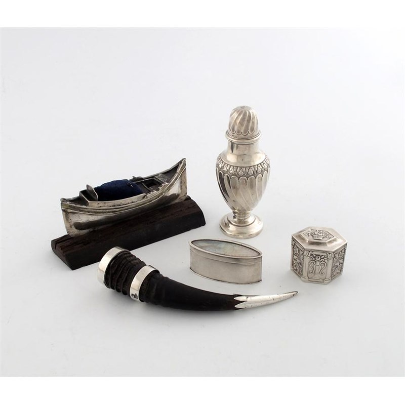 comprising: a silver mounted horn pepper pot, unmarked, probably Scottish or Indian, inscribed 'PEPPER', plus a late 19th century German silver mounted mother-of-pearl box, another box, a small Maltese boat, converted to a pin cushion, and a silver glue pot. (5)