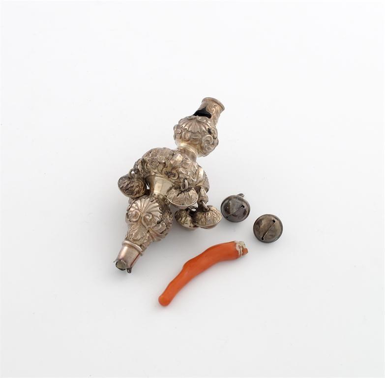 baluster form, embossed foliate decoration, two bells and coral teether loose, length 10.8cm.