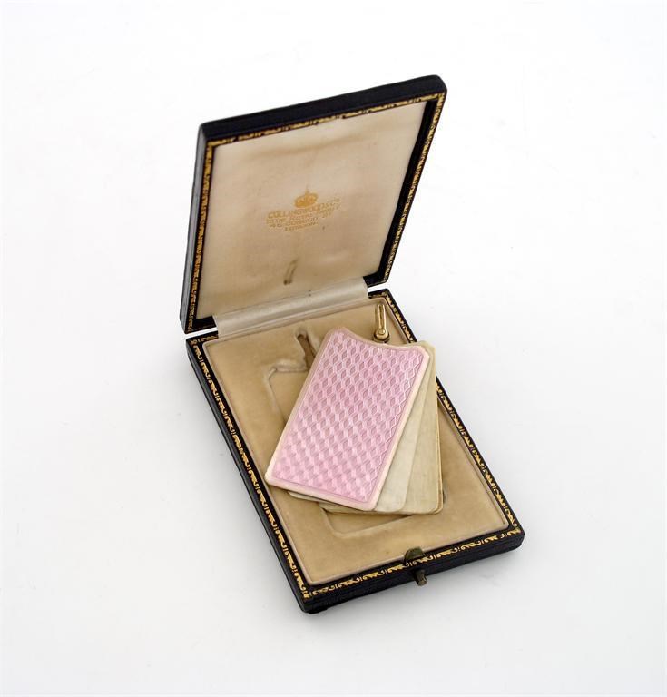 rectangular form, the hinged cover and base slides open to reveal three ivory panels, with a loop, in a fitted case, length 5.7cm.