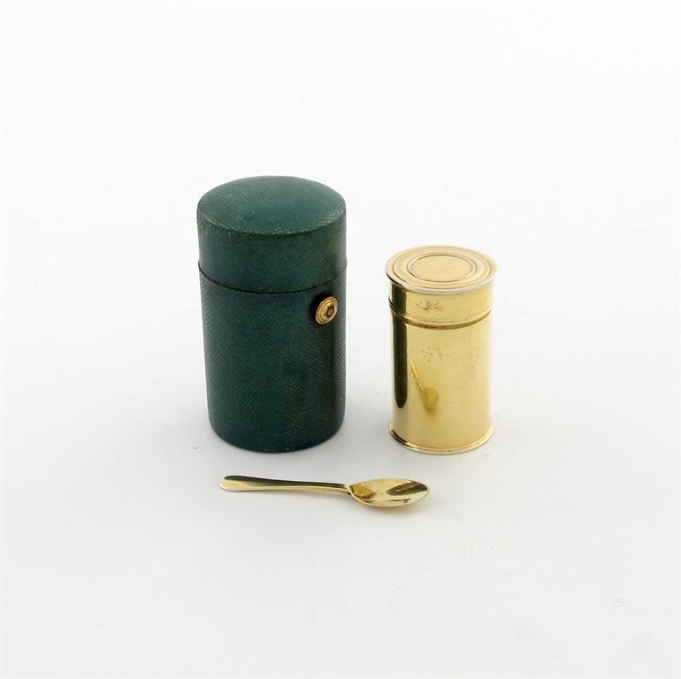 cylindrical form, the screw-off cover opens to reveal a pull-off lid with a ball finial, with a snuff spoon, in a fitted shagreen covered case, height 3.7cm, length of spoon 4.3cm. (2)